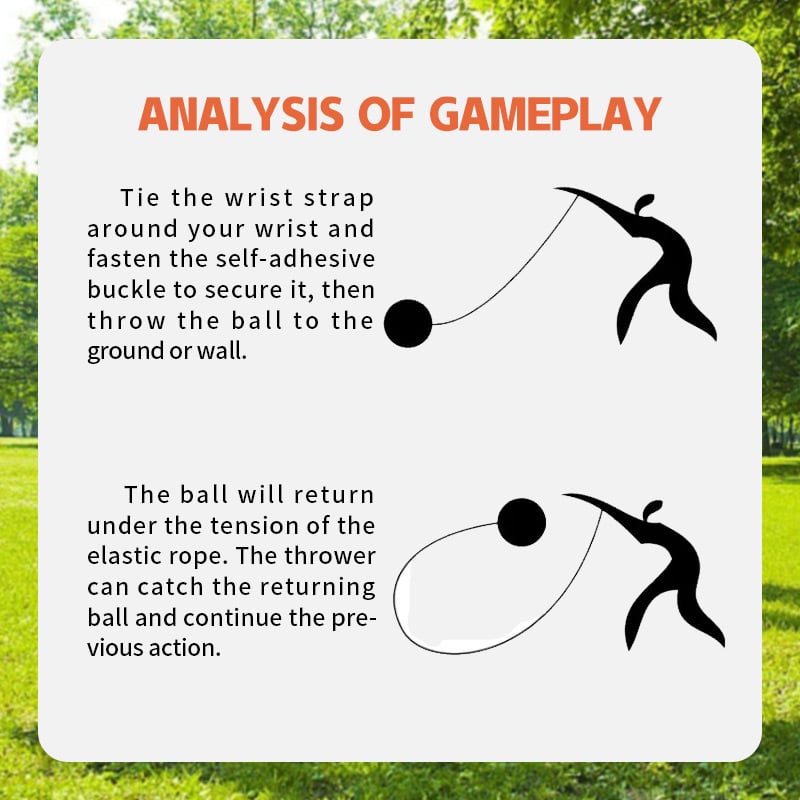 Analysis of gameplay:Tie the wrist strap on your hand and fasten the self-adhesive buckle, then throw the ball to the ground or wall,The ball member returns under the action of the tension rope,The thrower can catch the returning ball.